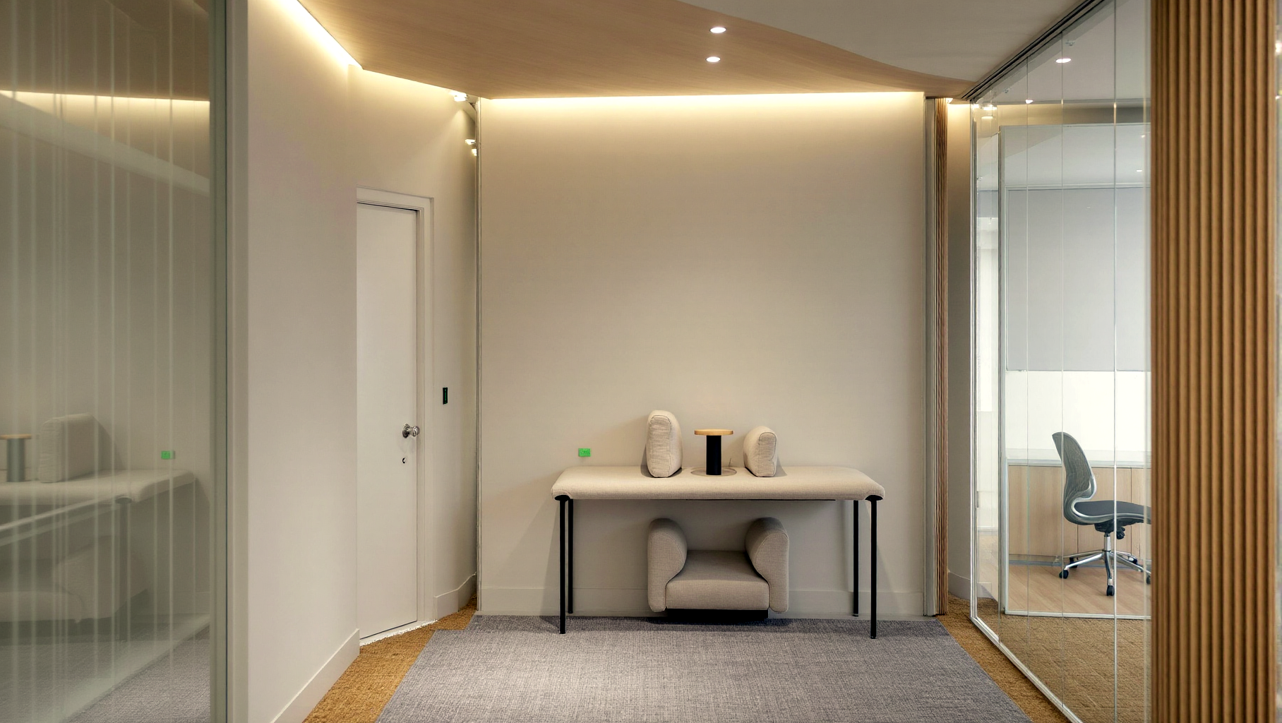 Facing the main circulation path, the desk symbolizes openness and shared vision,